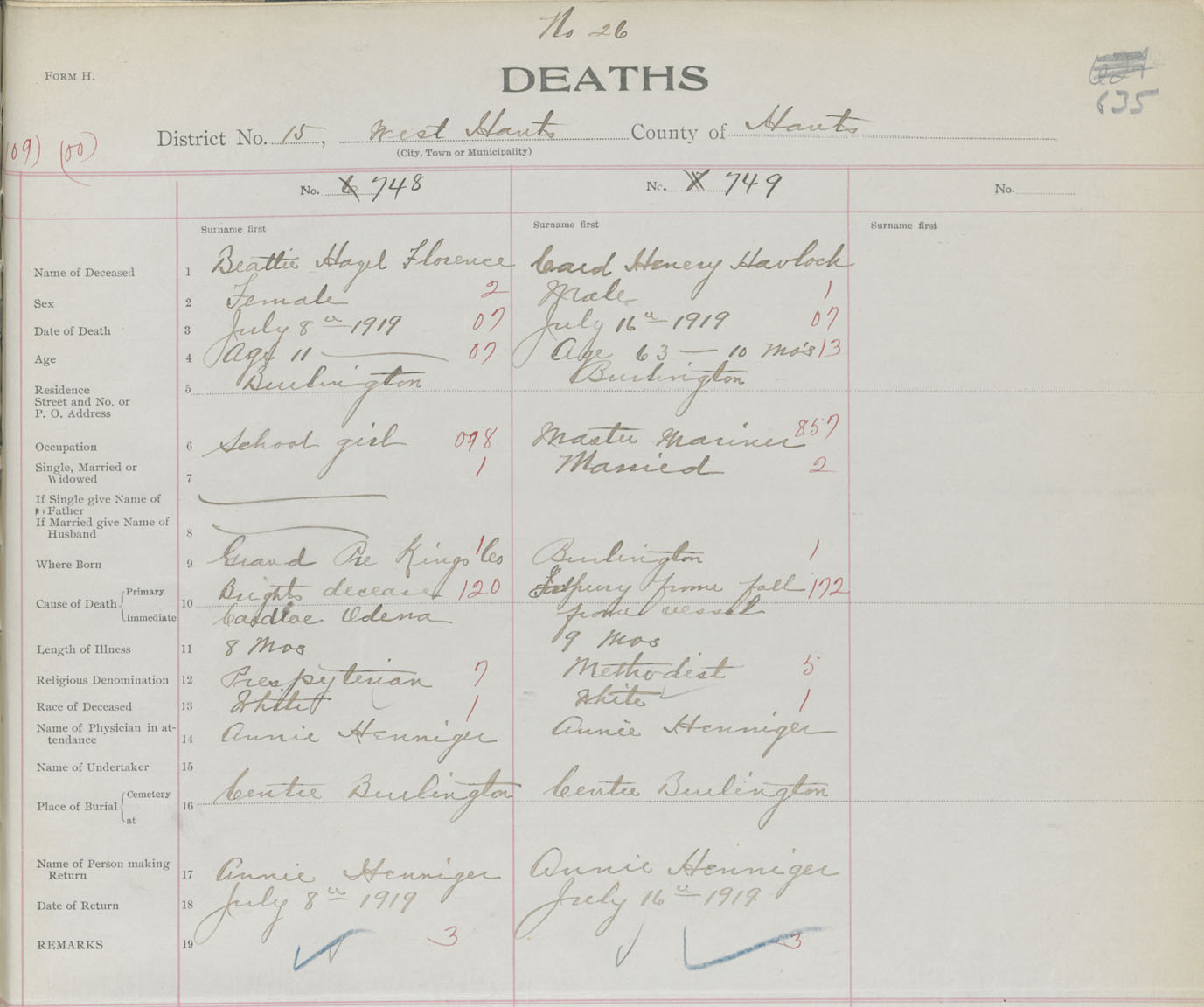 Female Death Registration: Year: 1919 book: 35 page: 635 number: 748