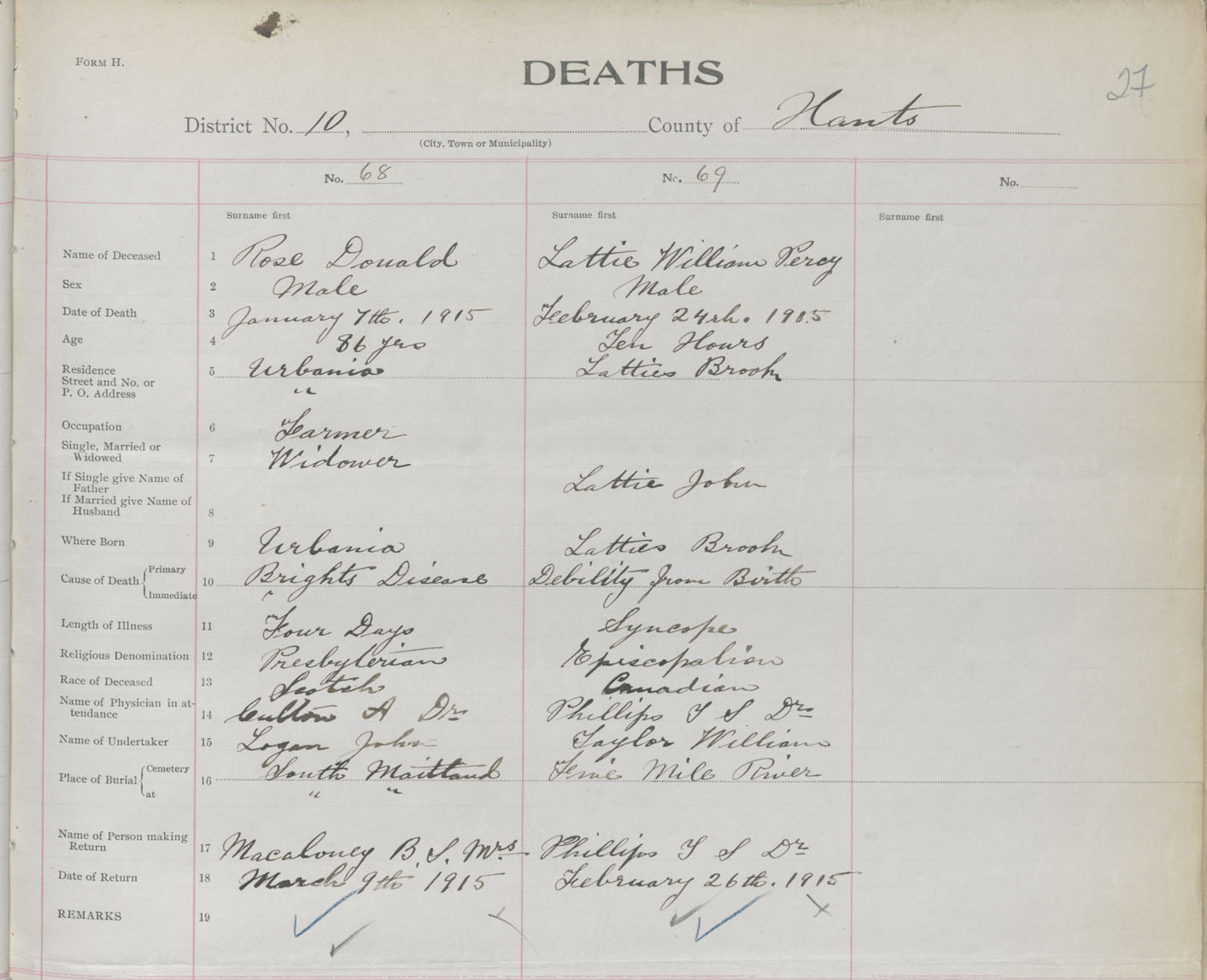 Male Death Registration: Year: 1915 book: 36 page: 27 number: 69