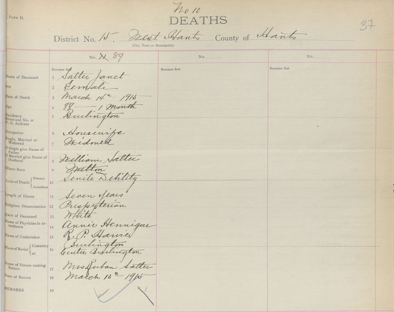 Female Death Registration: Year: 1915 book: 36 page: 37 number: 89