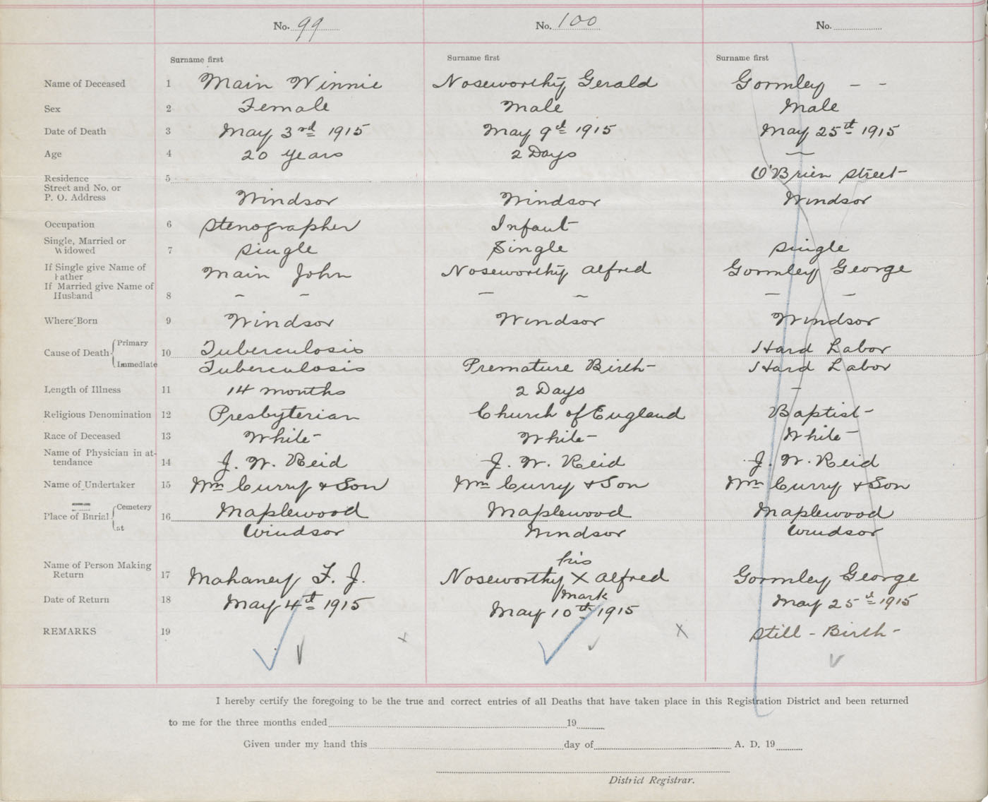 Female Death Registration: Year: 1915 book: 36 page: 40 number: 99