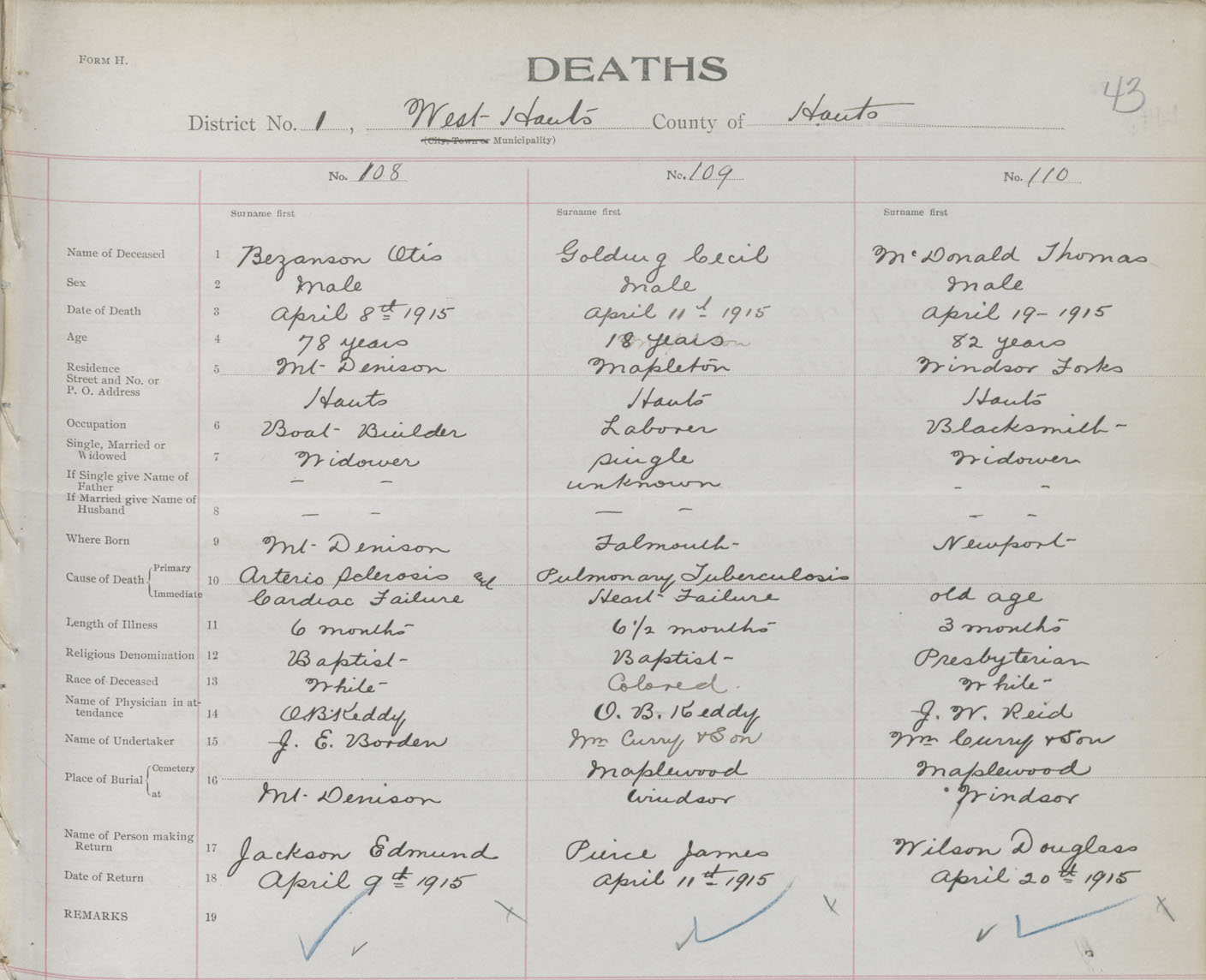 Male Death Registration: Year: 1915 book: 36 page: 43 number: 108