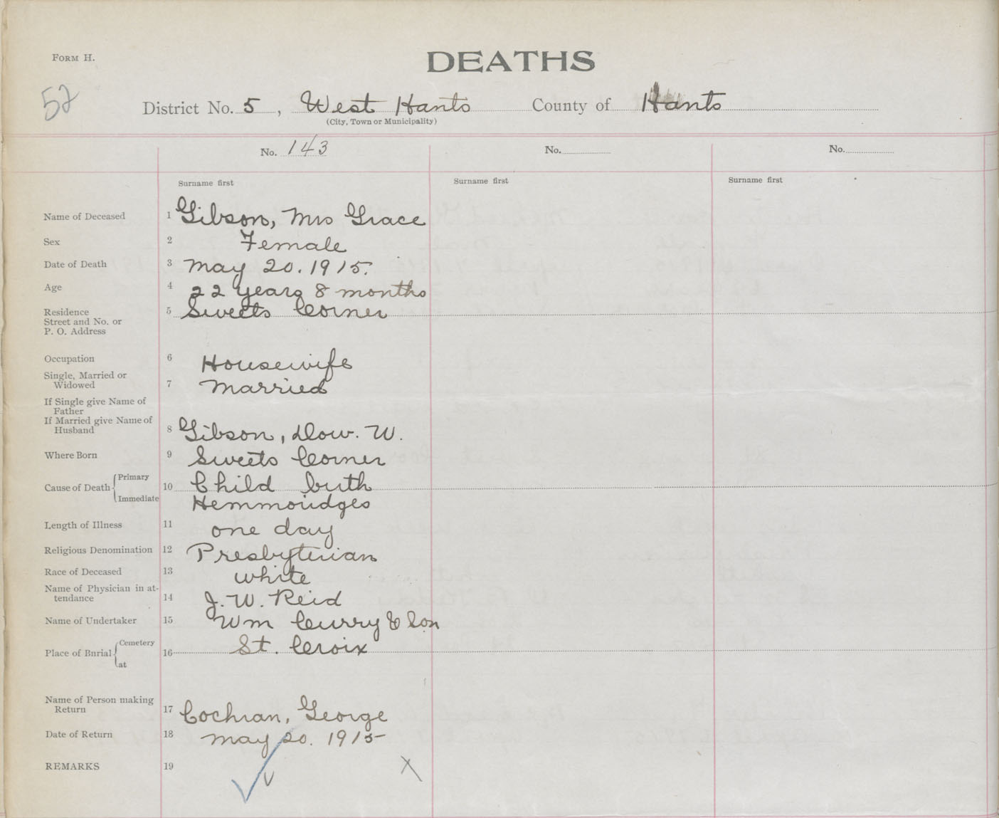 Female Death Registration: Year: 1915 book: 36 page: 52 number: 143