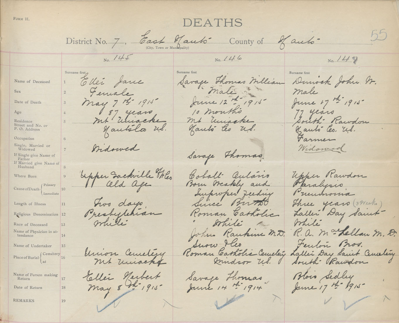 Male Death Registration: Year: 1915 book: 36 page: 55 number: 147
