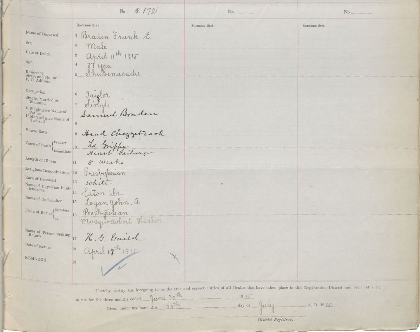 Male Death Registration: Year: 1915 book: 36 page: 65 number: 172