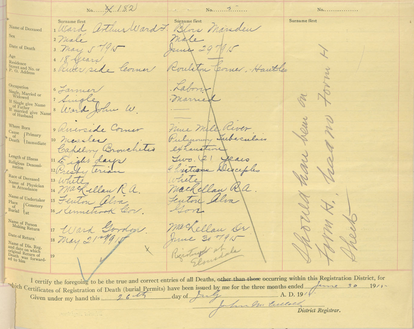 Male Death Registration: Year: 1915 book: 36 page: 69 number: 182