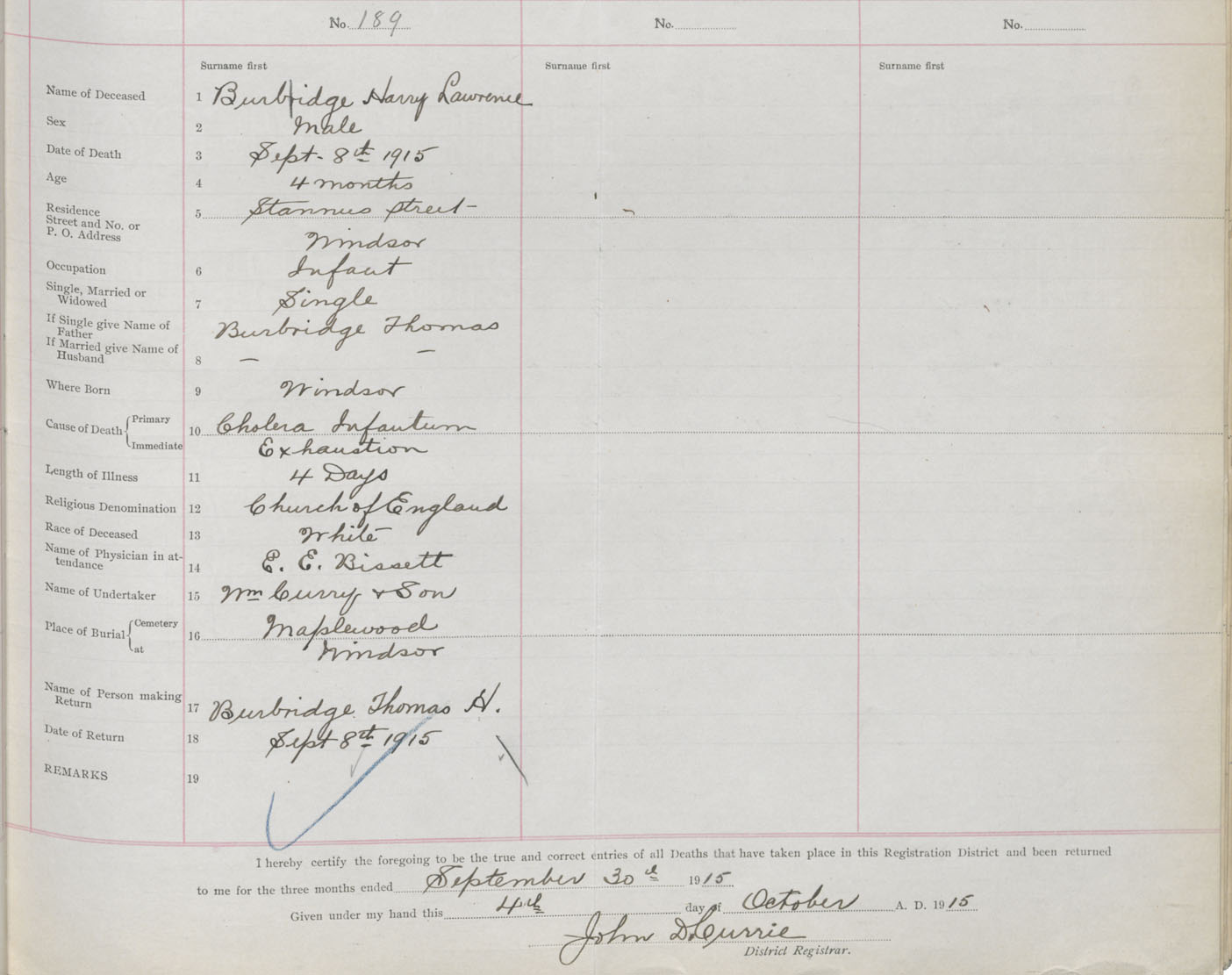Male Death Registration: Year: 1915 book: 36 page: 73 number: 189