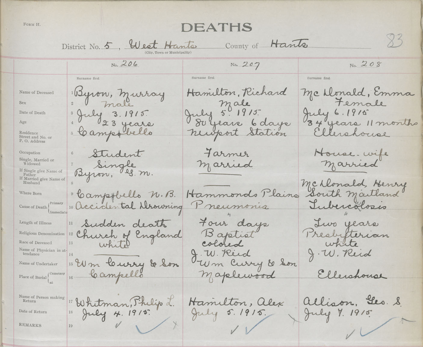 Male Death Registration: Year: 1915 book: 36 page: 83 number: 206