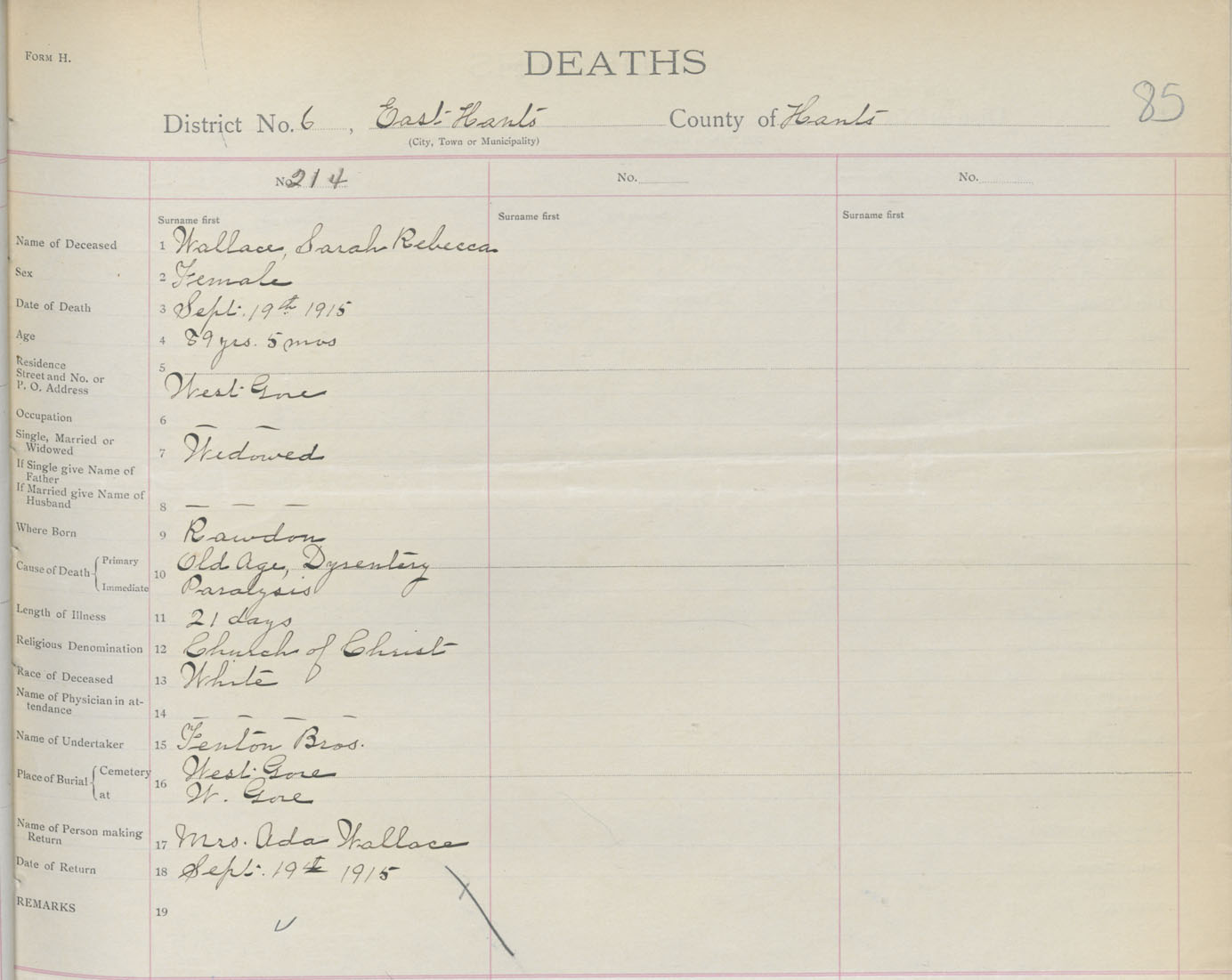 Female Death Registration: Year: 1915 book: 36 page: 85 number: 214