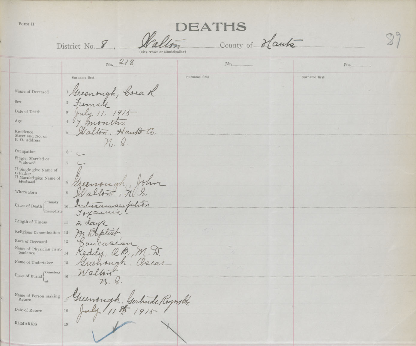 Female Death Registration: Year: 1915 book: 36 page: 89 number: 218