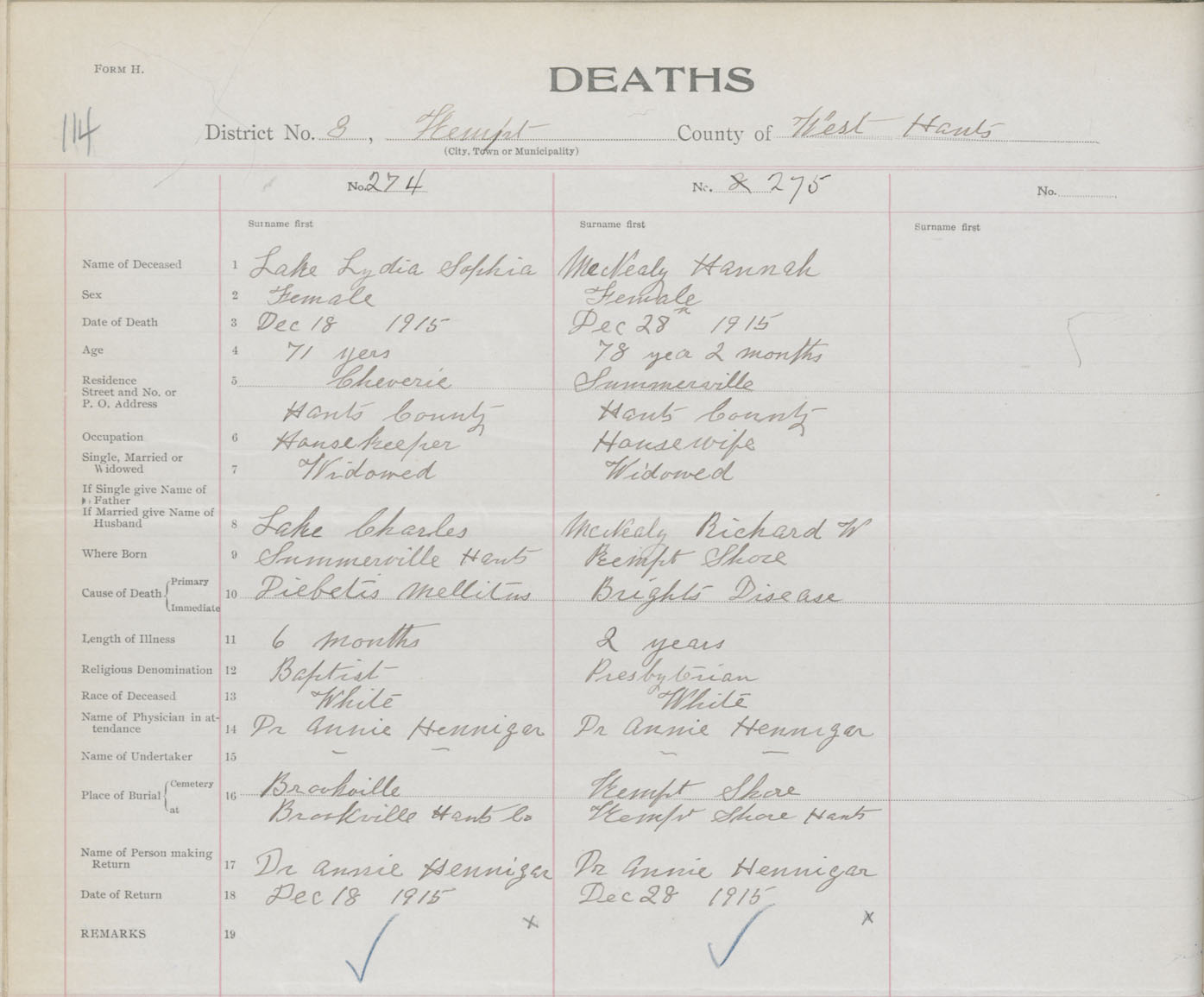 Female Death Registration: Year: 1915 book: 36 page: 114 number: 275