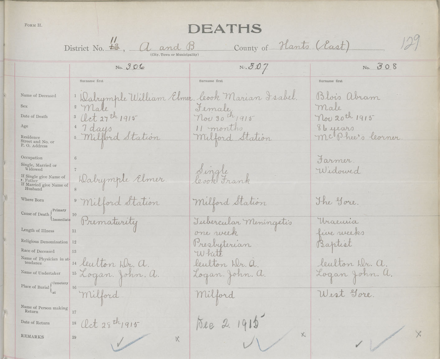 Male Death Registration: Year: 1915 book: 36 page: 129 number: 308