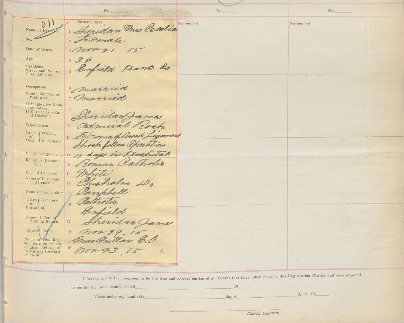 Female Death Registration: Year: 1915 book: 36 page: 131 number: 311