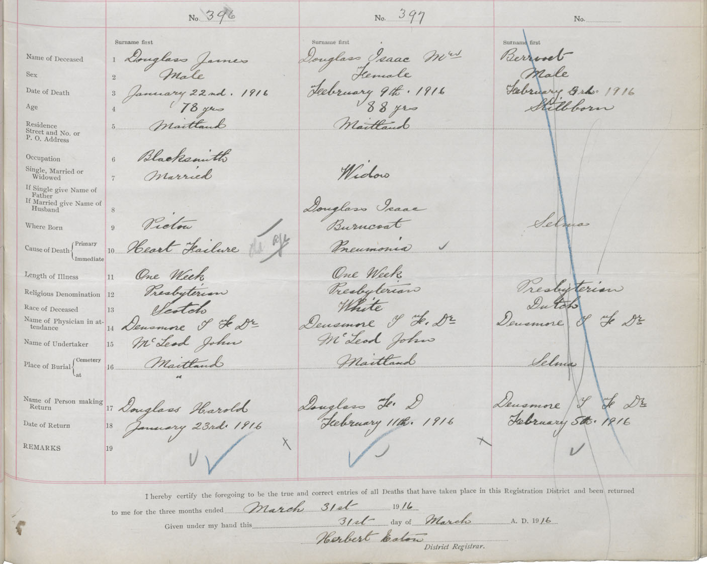 Female Death Registration: Year: 1916 book: 36 page: 161 number: 397