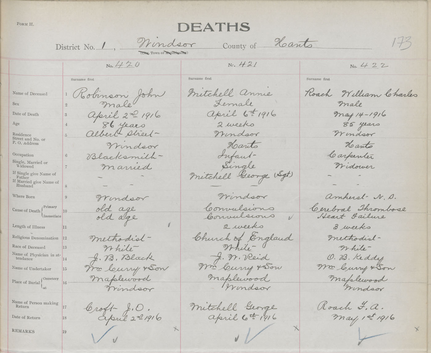 Male Death Registration: Year: 1916 book: 36 page: 173 number: 422