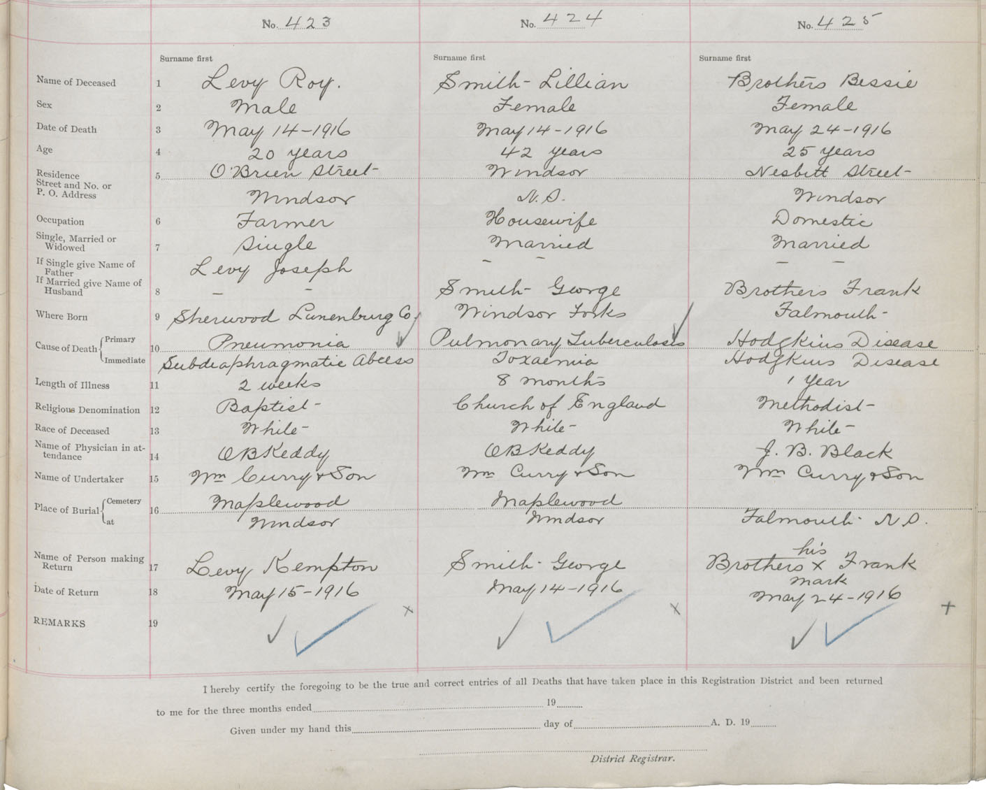 Female Death Registration: Year: 1916 book: 36 page: 173 number: 425