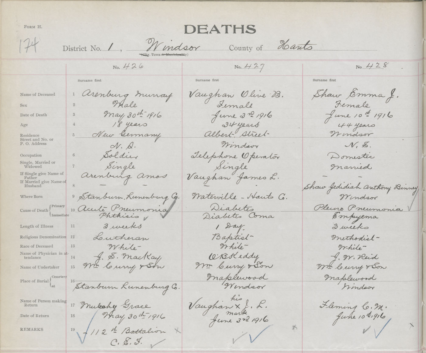 Female Death Registration: Year: 1916 book: 36 page: 174 number: 428