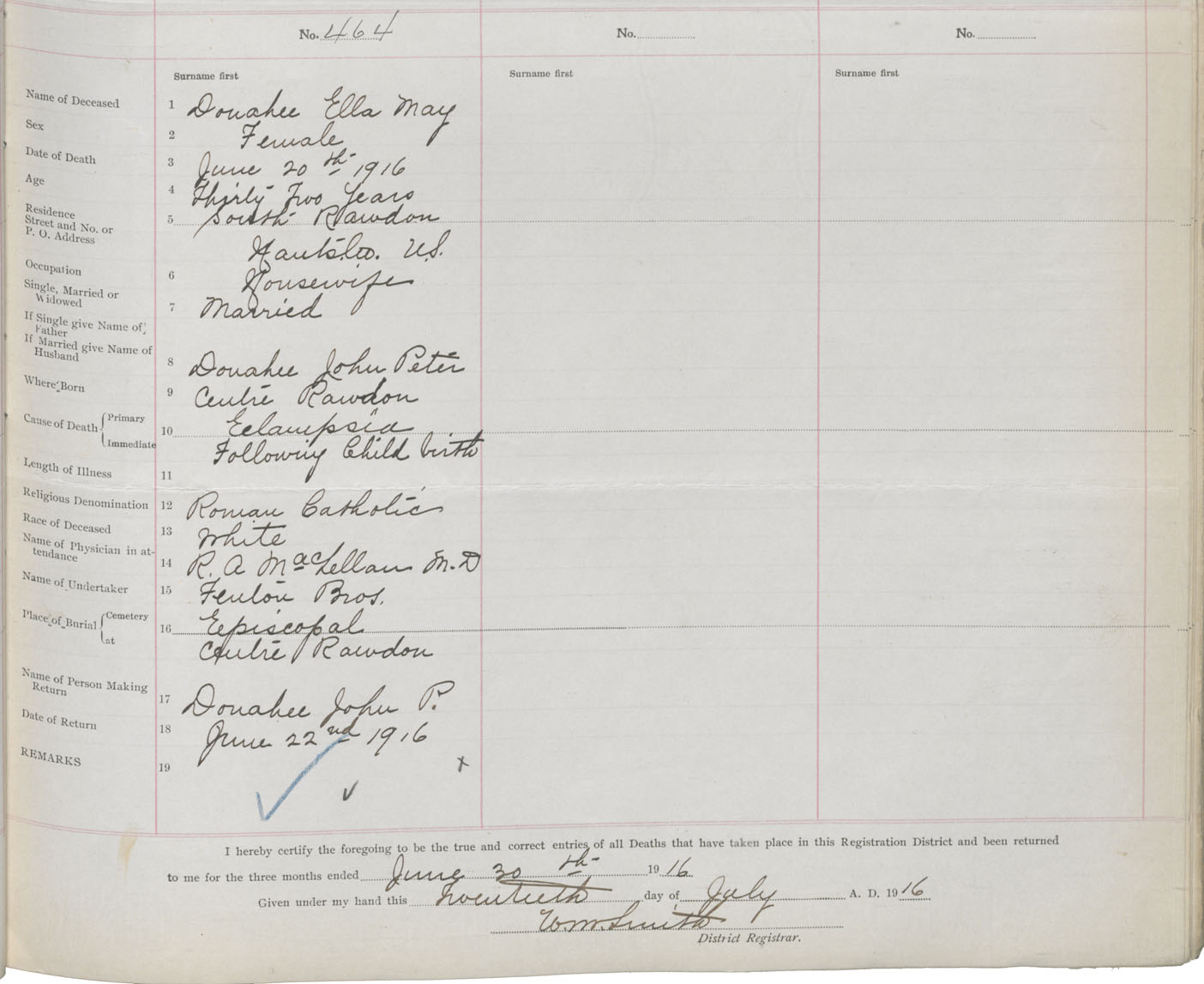 Female Death Registration: Year: 1916 book: 36 page: 189 number: 464