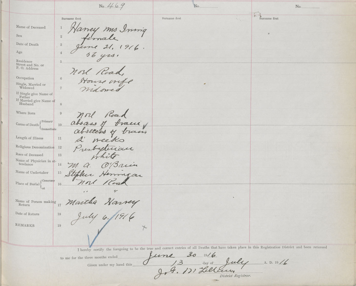 Female Death Registration: Year: 1916 book: 36 page: 193 number: 469