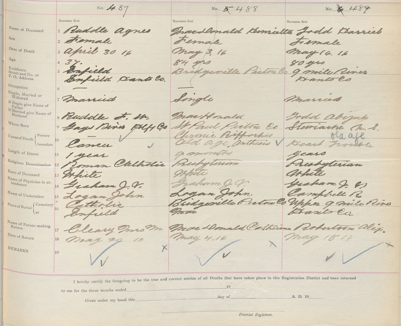 Female Death Registration: Year: 1916 book: 36 page: 199 number: 489