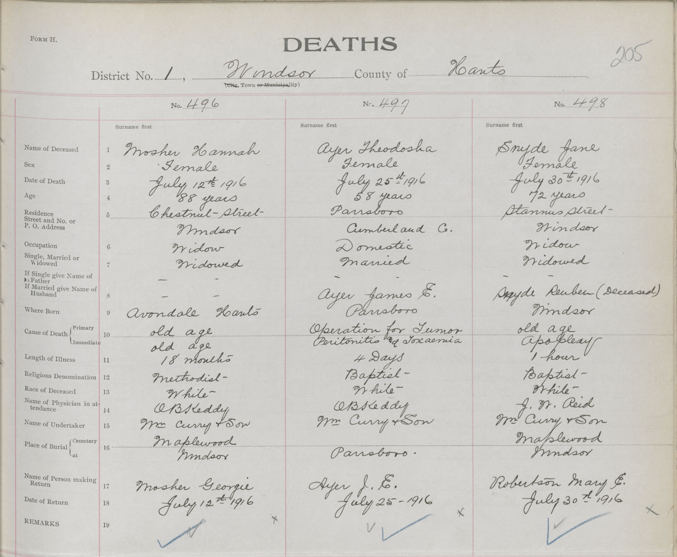 Female Death Registration: Year: 1916 book: 36 page: 205 number: 498