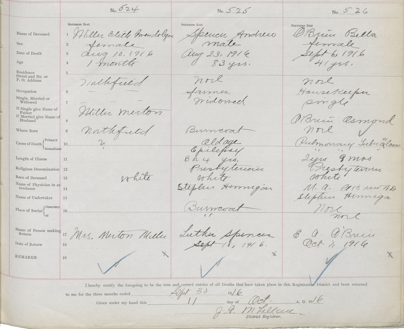 Female Death Registration: Year: 1916 book: 36 page: 219 number: 526