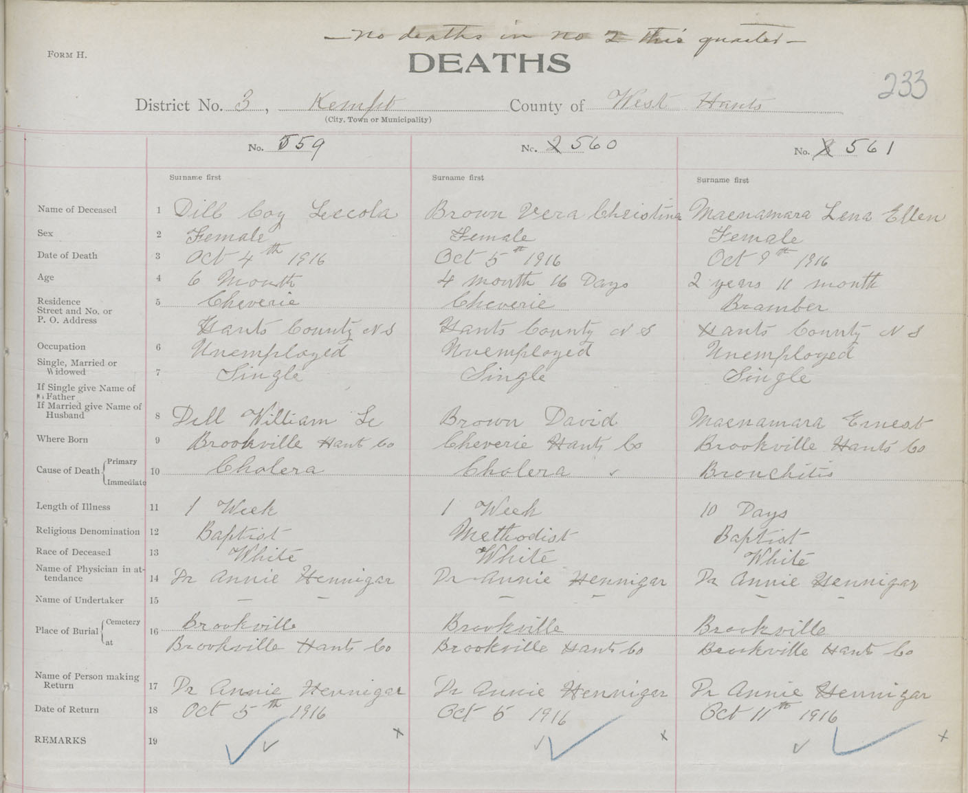 Female Death Registration: Year: 1916 book: 36 page: 233 number: 561
