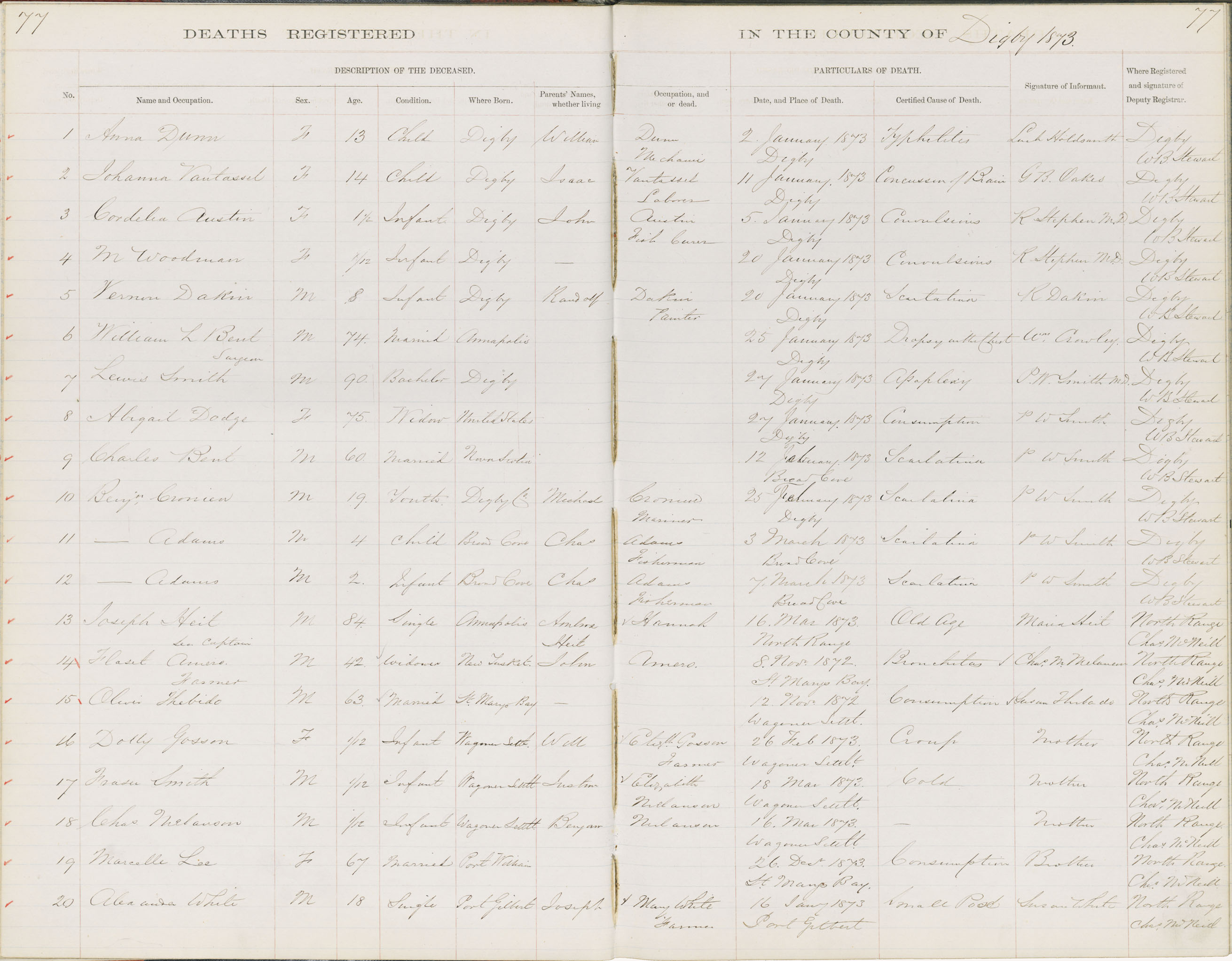 Death Registration: Year: 1873 book: 1806 page: 77 number: 20
