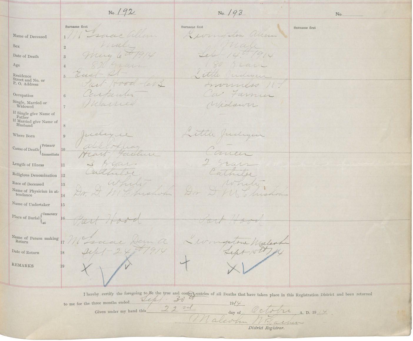 Male Death Registration: Year: 1914 book: 37 page: 83 number: 192