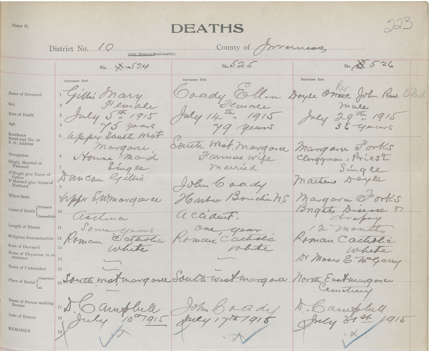 Male Death Registration: Year: 1915 book: 37 page: 223 number: 526