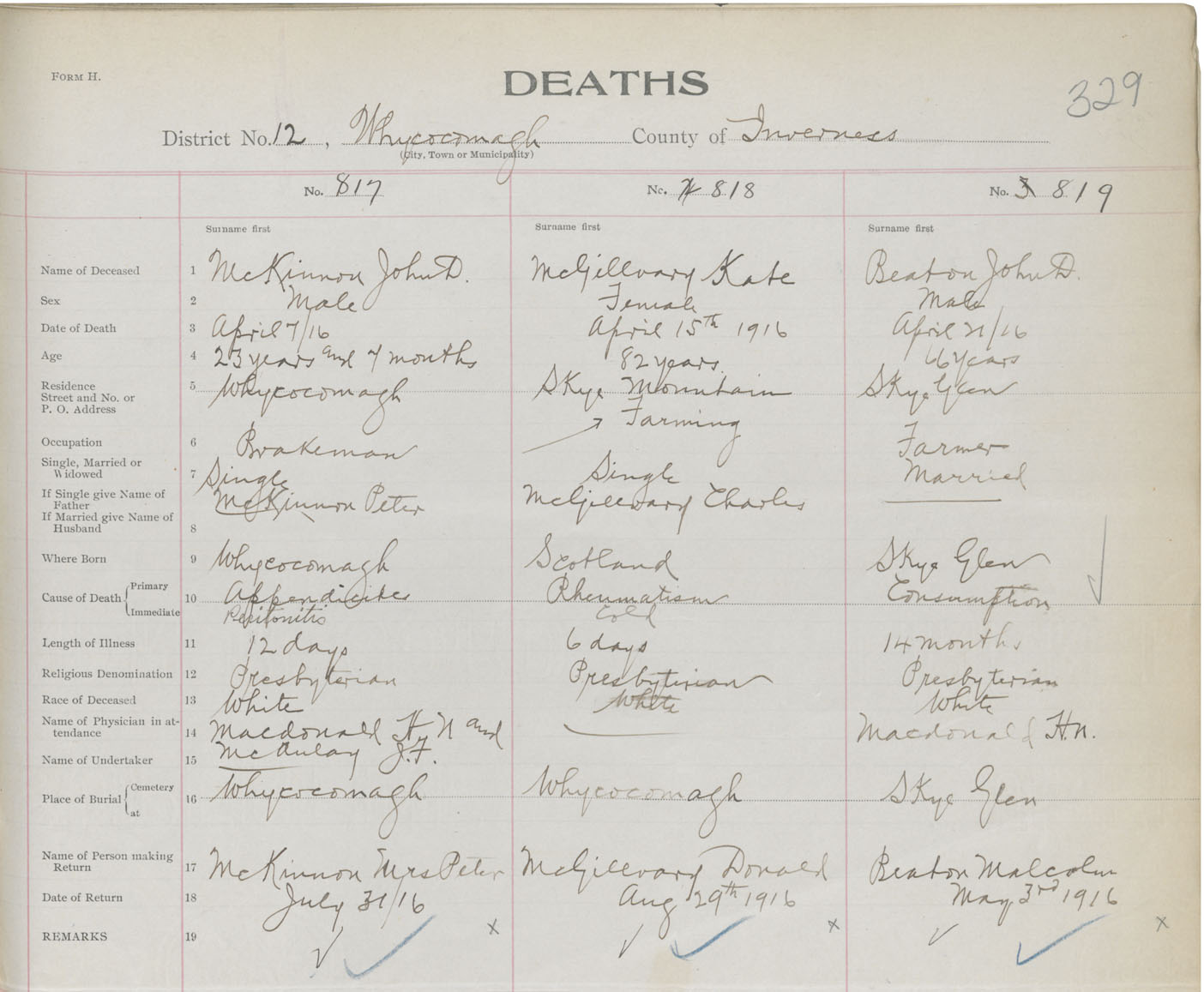 Death Registration: Year: 1916 book: 37 page: 329 number: 819
