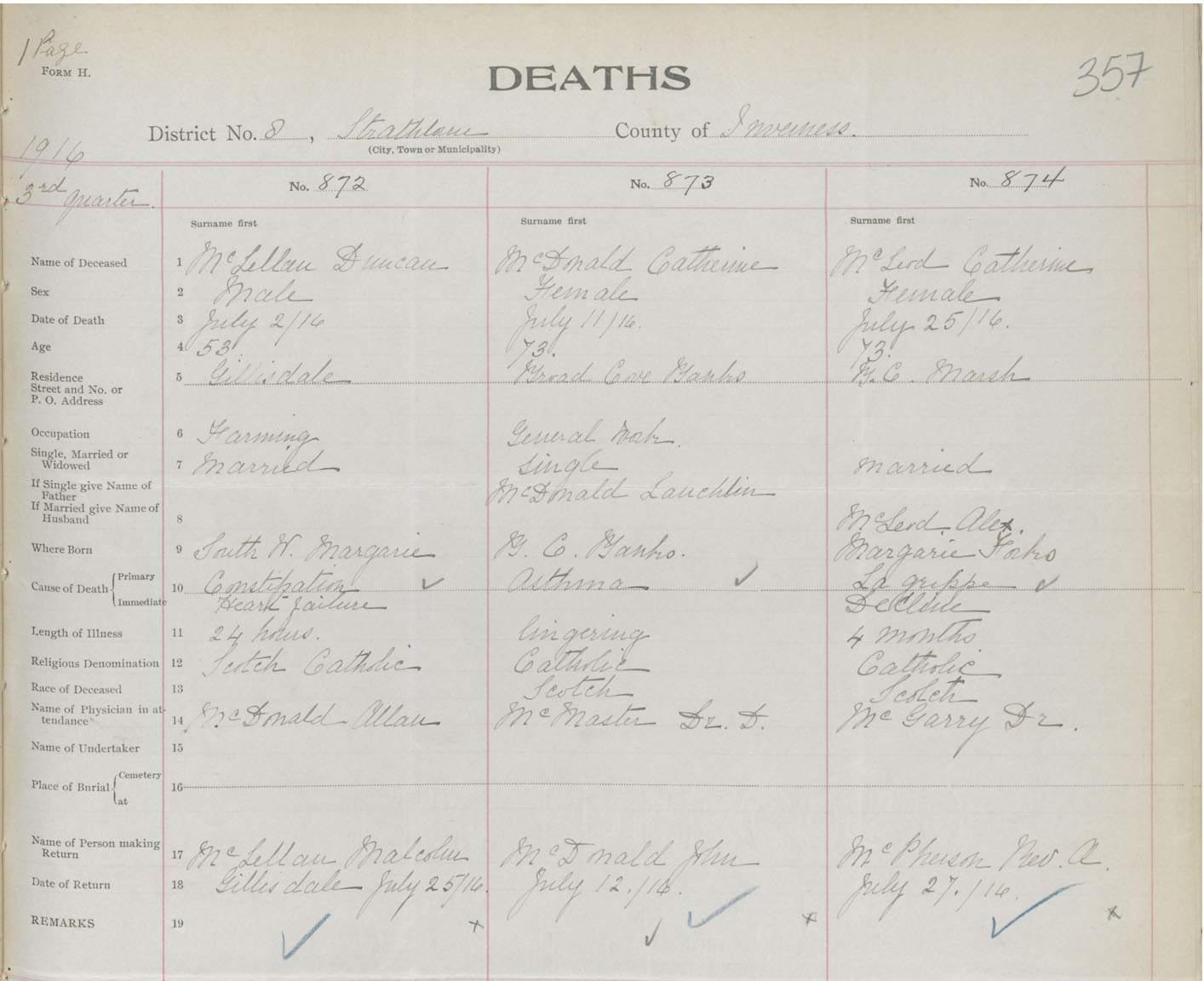 Death Registration: Year: 1916 book: 37 page: 357 number: 874