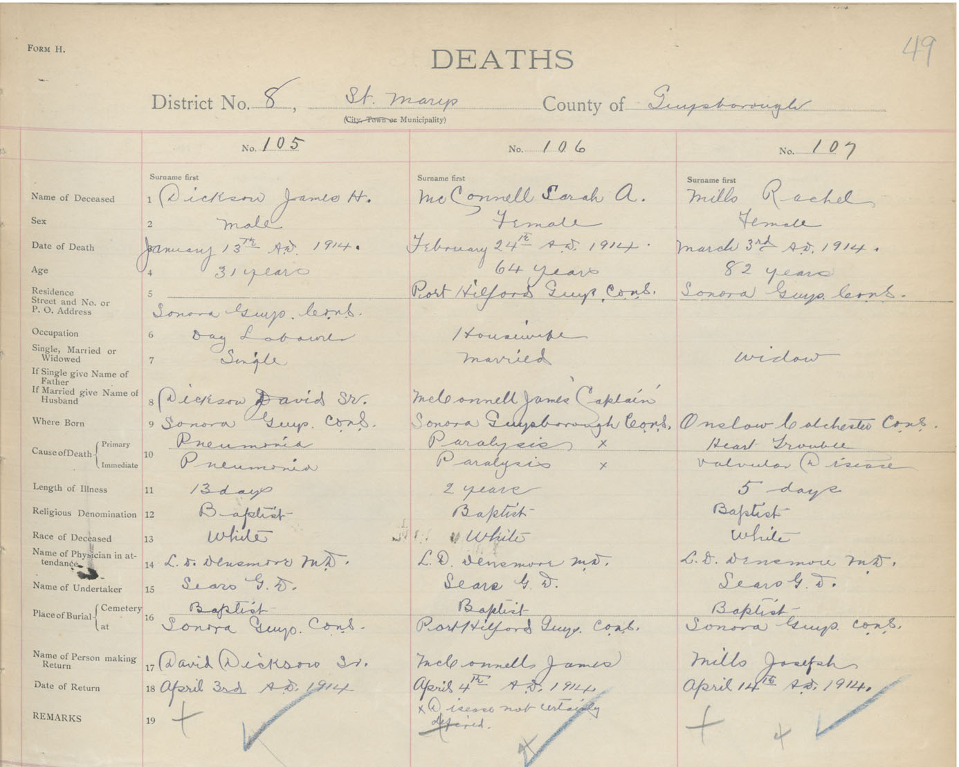 Male Death Registration: Year: 1914 book: 38 page: 49 number: 105