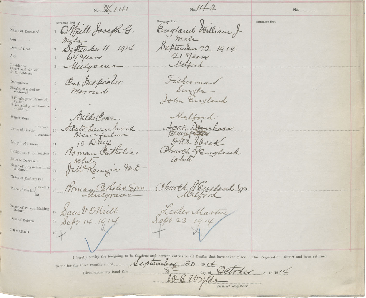 Male Death Registration: Year: 1914 book: 38 page: 65 number: 142