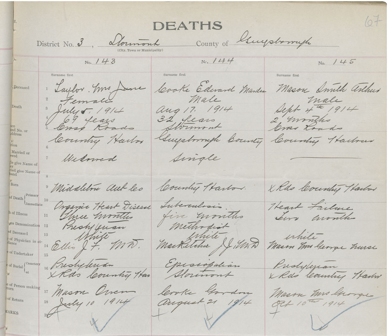 Male Death Registration: Year: 1914 book: 38 page: 67 number: 145