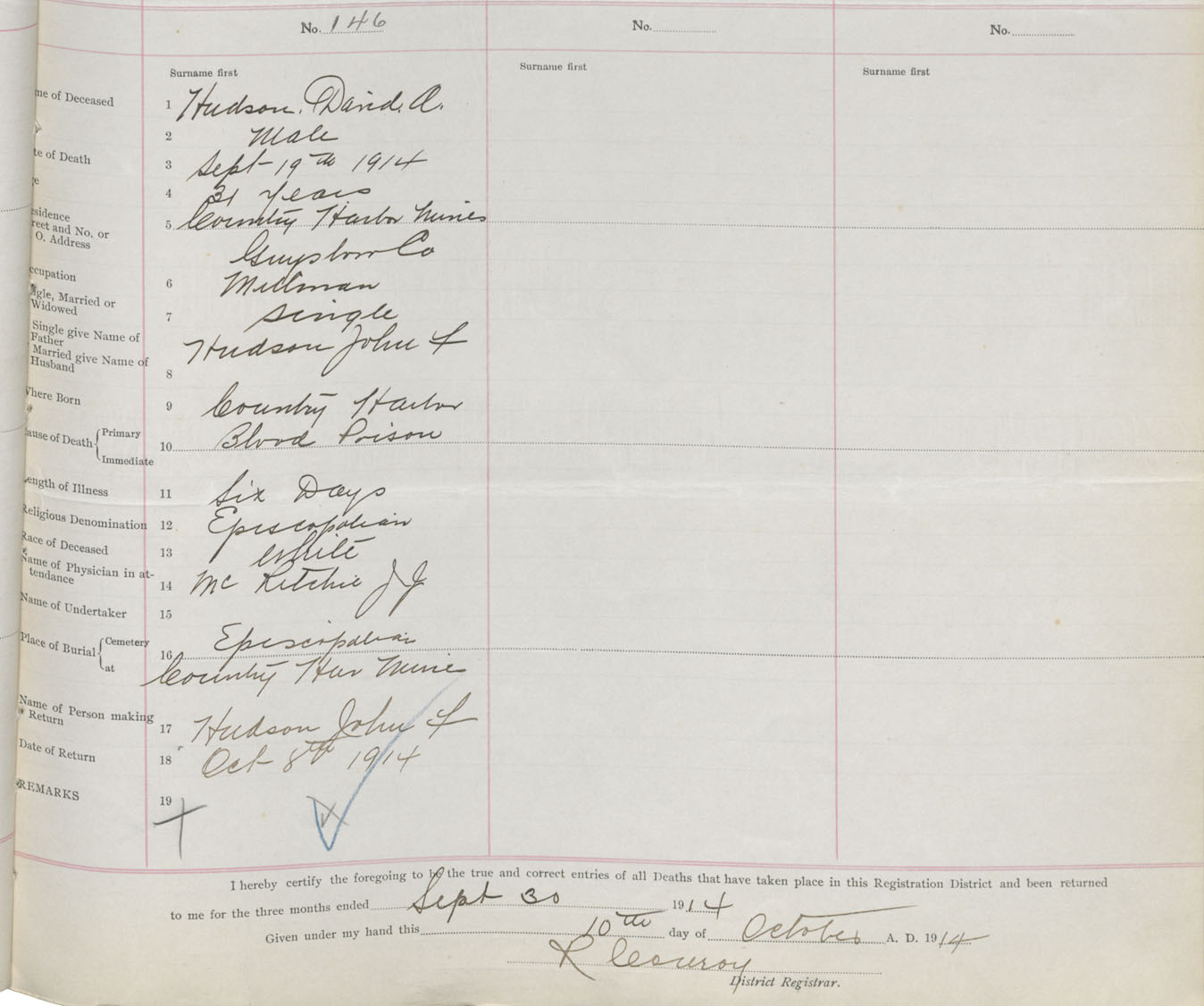 Male Death Registration: Year: 1914 book: 38 page: 67 number: 146