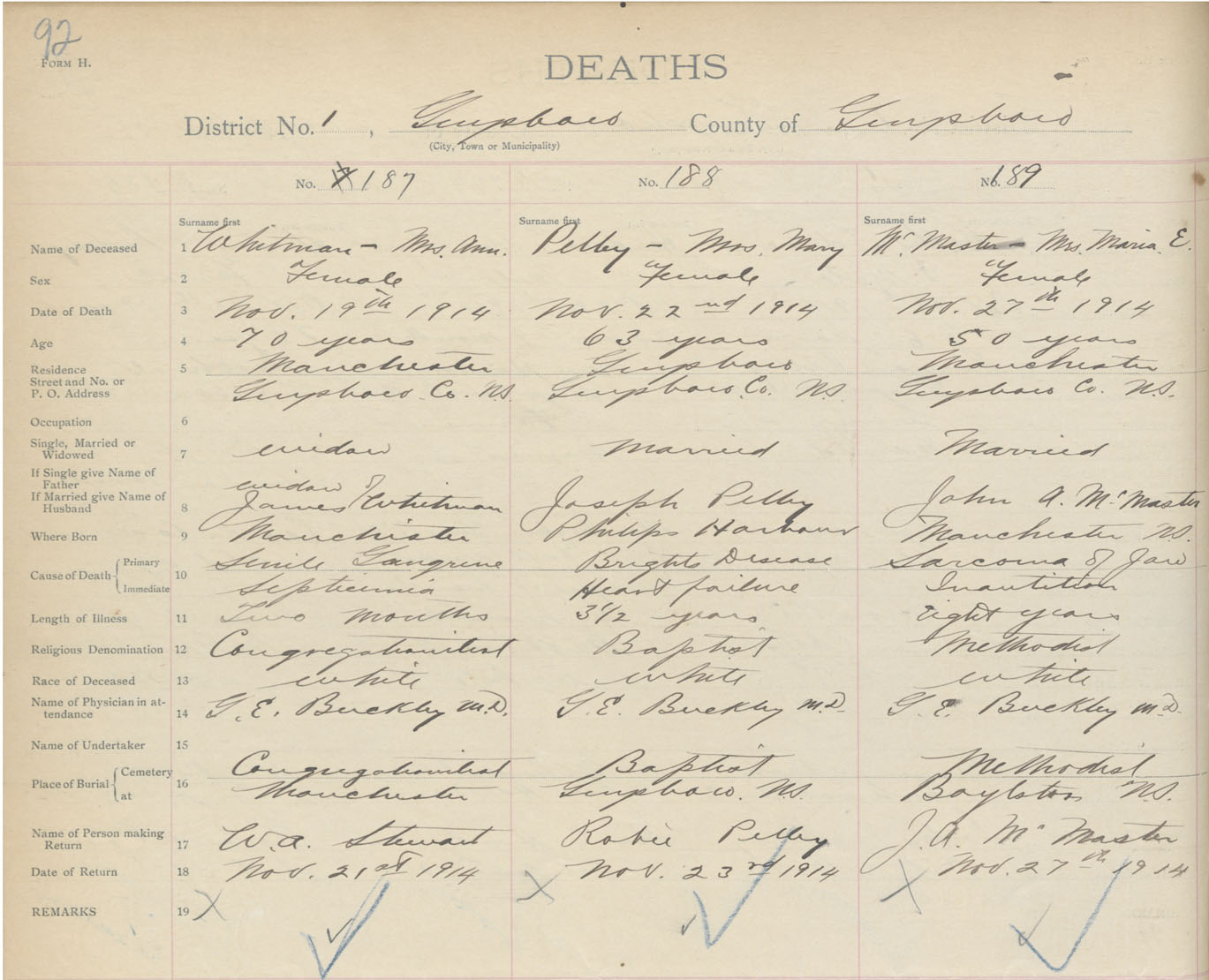 Female Death Registration: Year: 1914 book: 38 page: 92 number: 189