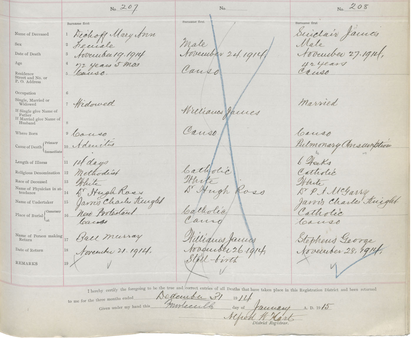Male Death Registration: Year: 1914 book: 38 page: 101 number: 208