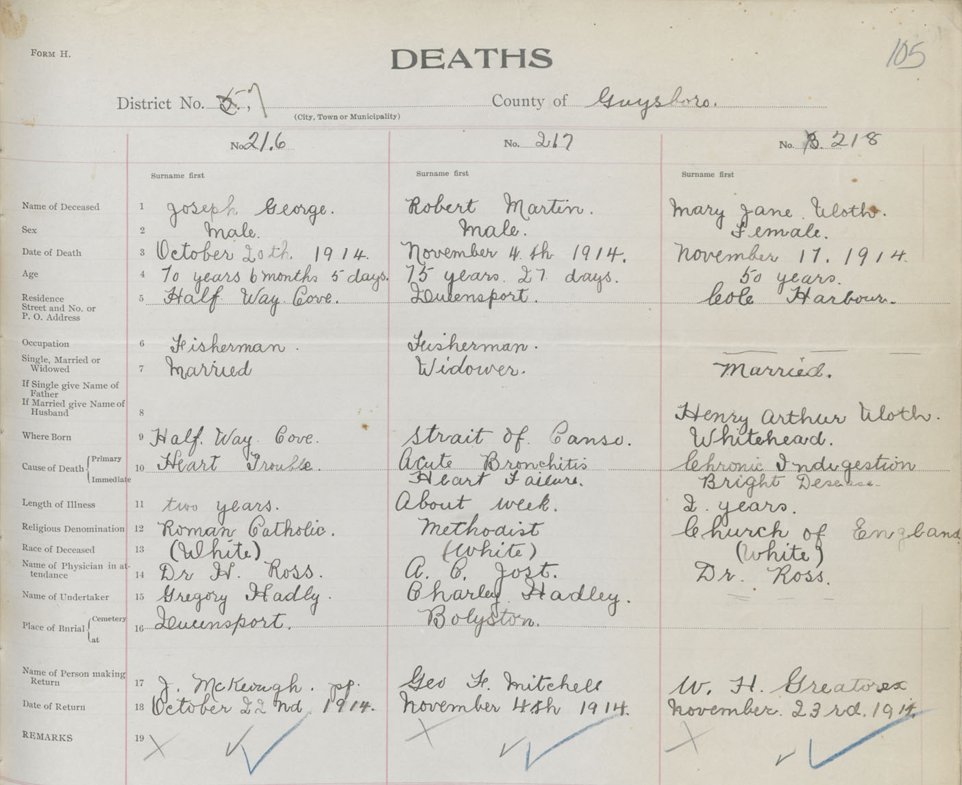 Female Death Registration: Year: 1914 book: 38 page: 105 number: 218