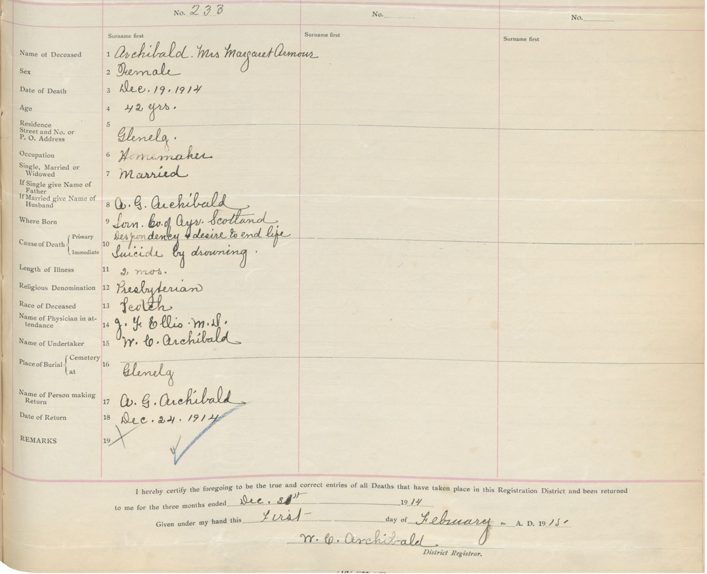 Female Death Registration: Year: 1914 book: 38 page: 111 number: 233