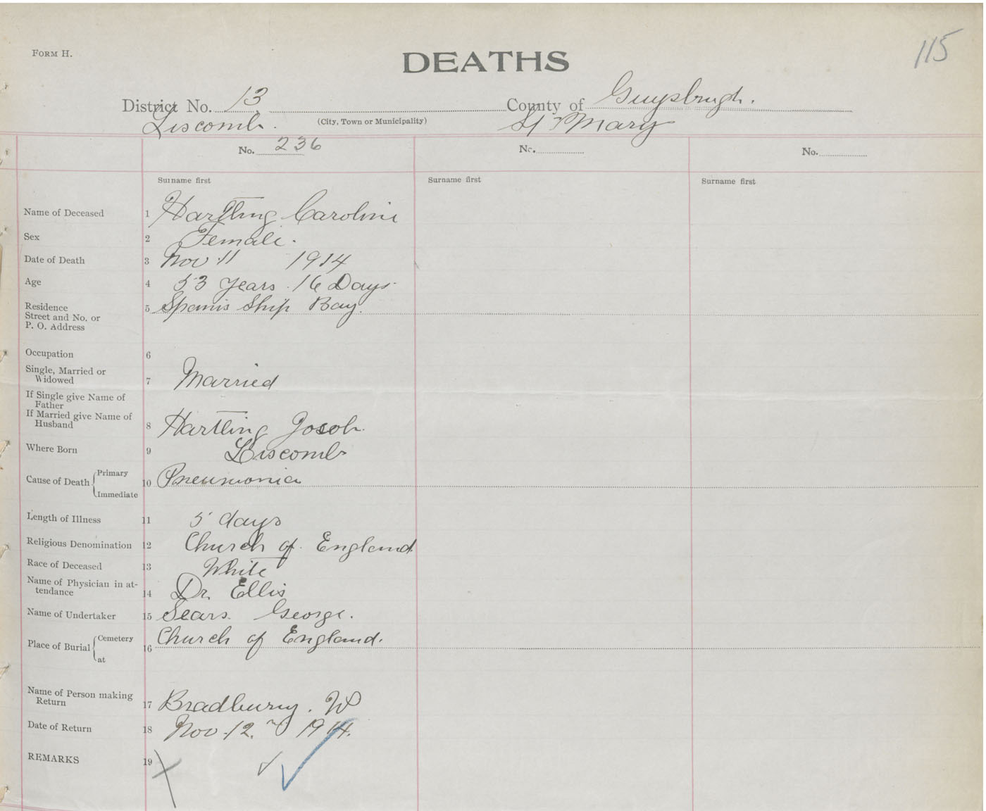 Female Death Registration: Year: 1914 book: 38 page: 115 number: 236
