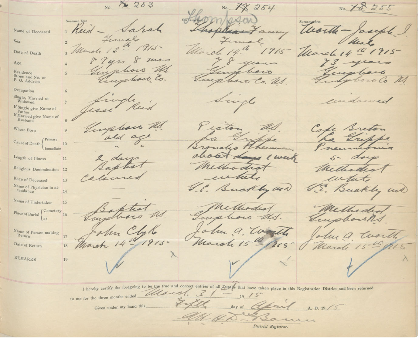 Male Death Registration: Year: 1915 book: 38 page: 123 number: 255