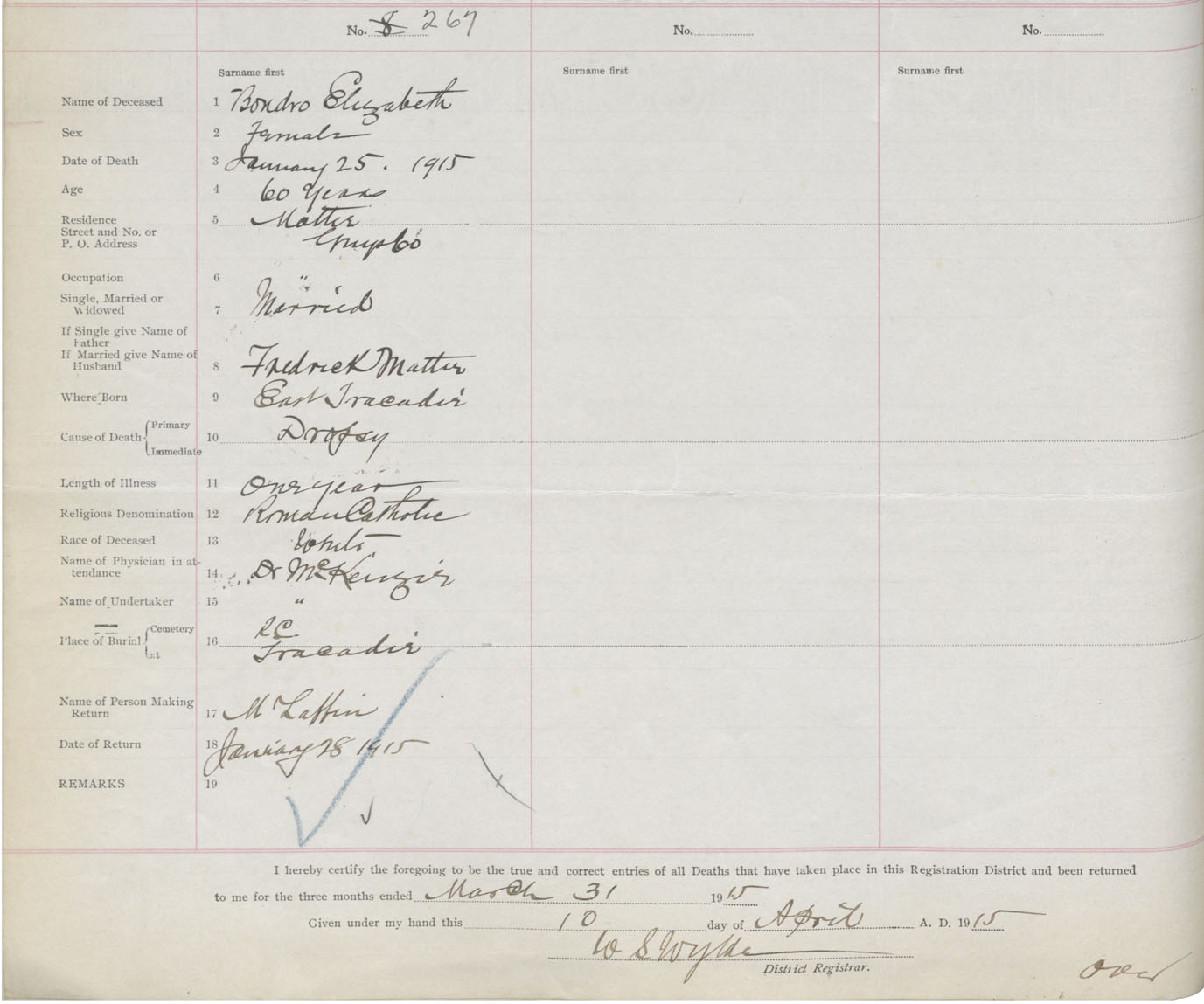 Female Death Registration: Year: 1915 book: 38 page: 126 number: 267