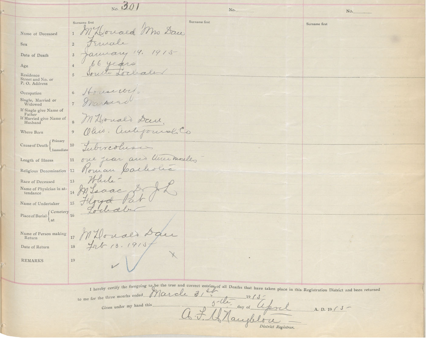Female Death Registration: Year: 1915 book: 38 page: 147 number: 301