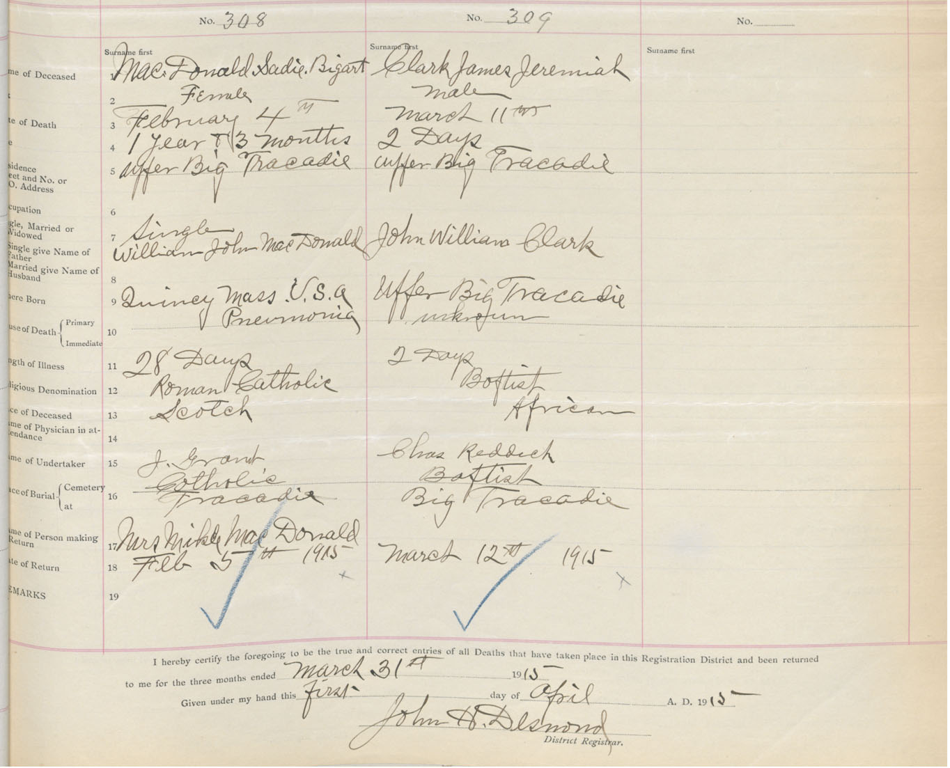 Male Death Registration: Year: 1915 book: 38 page: 151 number: 309