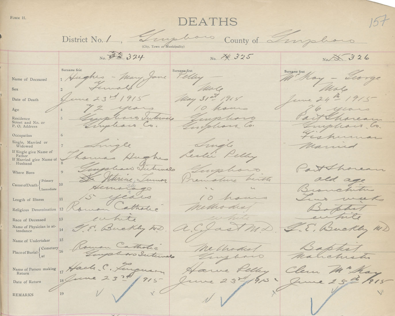 Male Death Registration: Year: 1915 book: 38 page: 157 number: 326