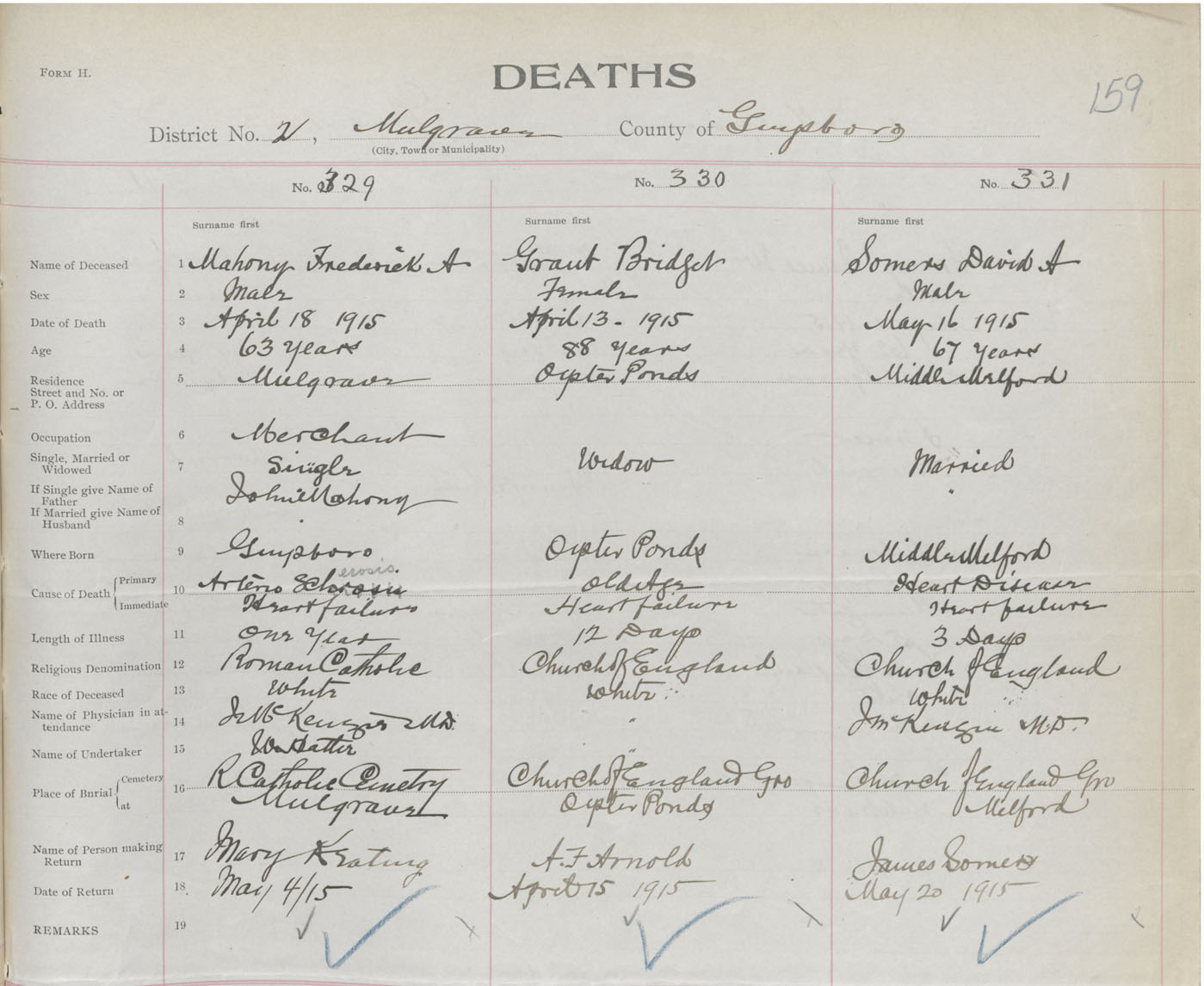 Male Death Registration: Year: 1915 book: 38 page: 159 number: 331