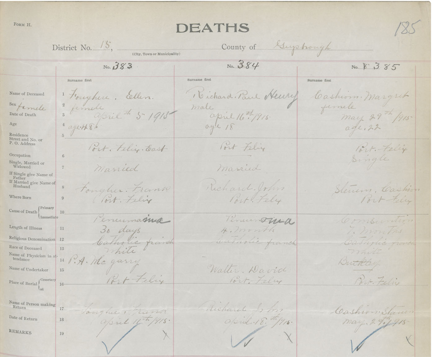 Female Death Registration: Year: 1915 book: 38 page: 185 number: 385