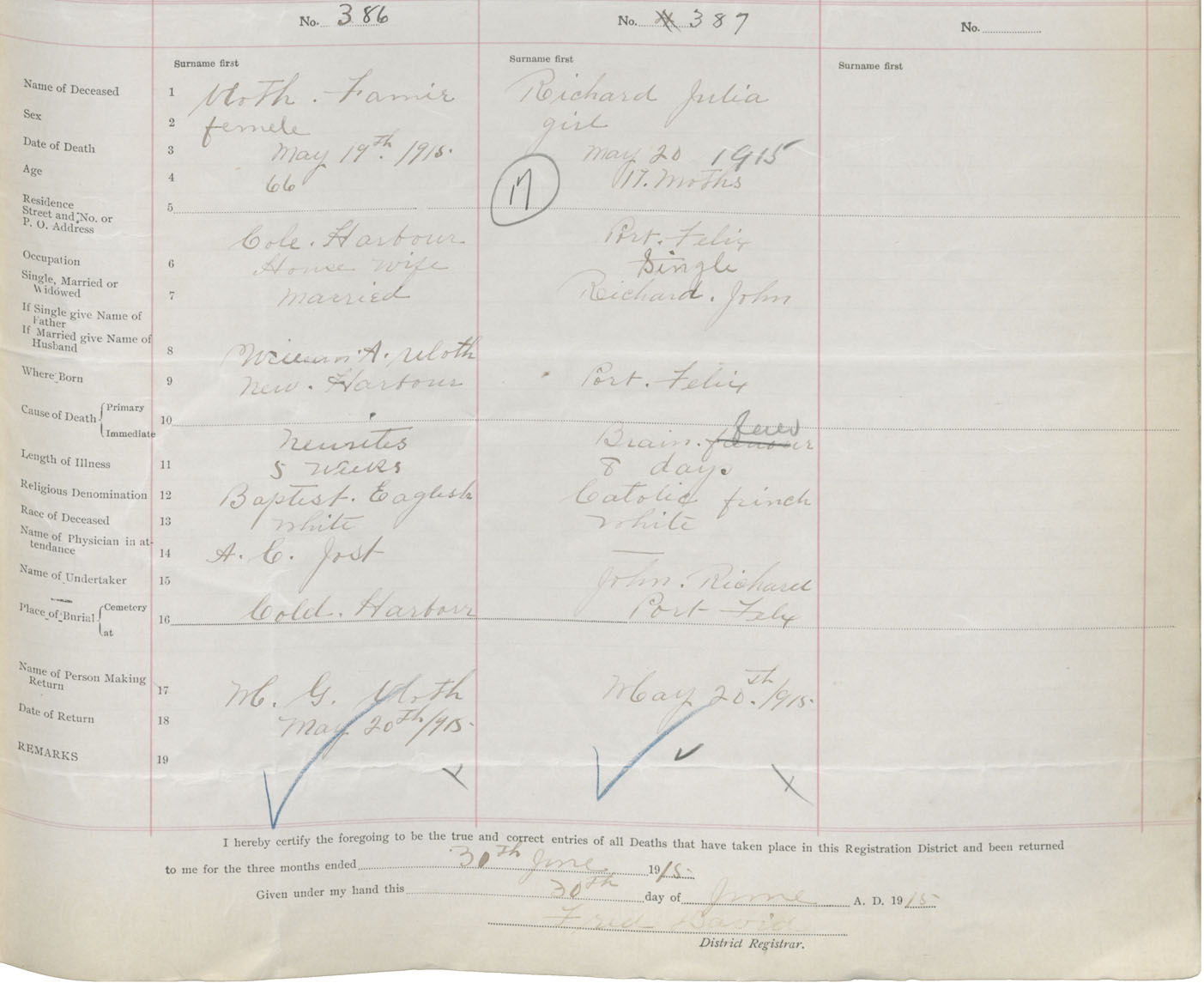 Female Death Registration: Year: 1915 book: 38 page: 185 number: 387