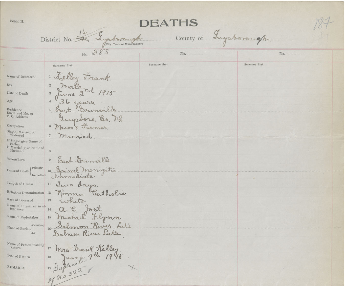 Male Death Registration: Year: 1915 book: 38 page: 187 number: 388