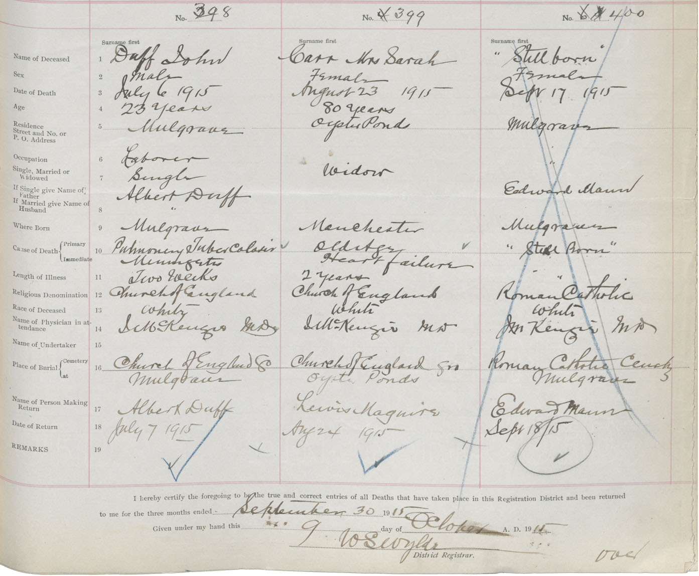 Female Death Registration: Year: 1915 book: 38 page: 191 number: 399